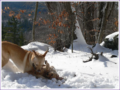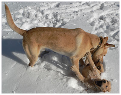 As you long-time readers are well aware, Henry and Ollie are the ever lovin' snow monkeys. They revel in the stuff. So it was good to see that our newest addition, despite her Southern Belle origins (she hails from Louisiana), will dash headfirst into the drifts and come up smiling.